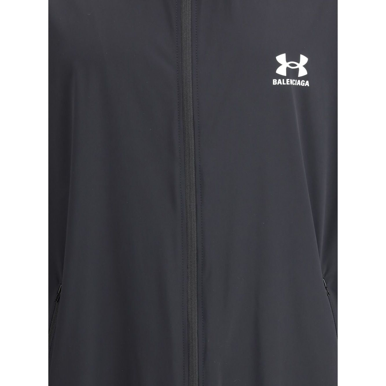 black front zip fastening high neck logo print to the front elasticated cuffs elasticated hem Balenciaga x Under Armour windbreaker Size and Fit - This piece fits true to size. We recommend you get your regular size. Model is 1,84m / 6ft 1in wearing size M